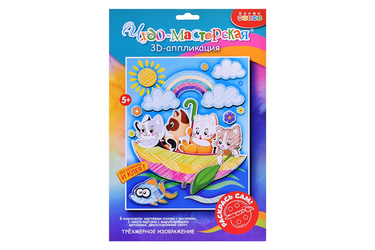 3Д аппликация. Раскраска. Котята в зонтике