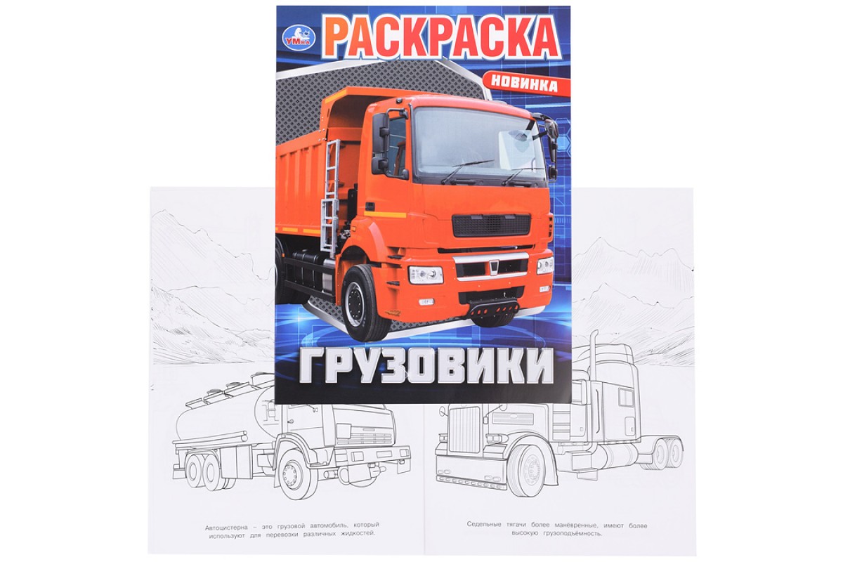 Эта увлекательная раскраска с разными видами грузовиков непременно понравится вашему ребёнку. В ней он найдёт интересные картинки с чёткими контурами и сюжетными текстами к ним. Благодаря удобному формату раскраску можно взять с собой в дорогу.