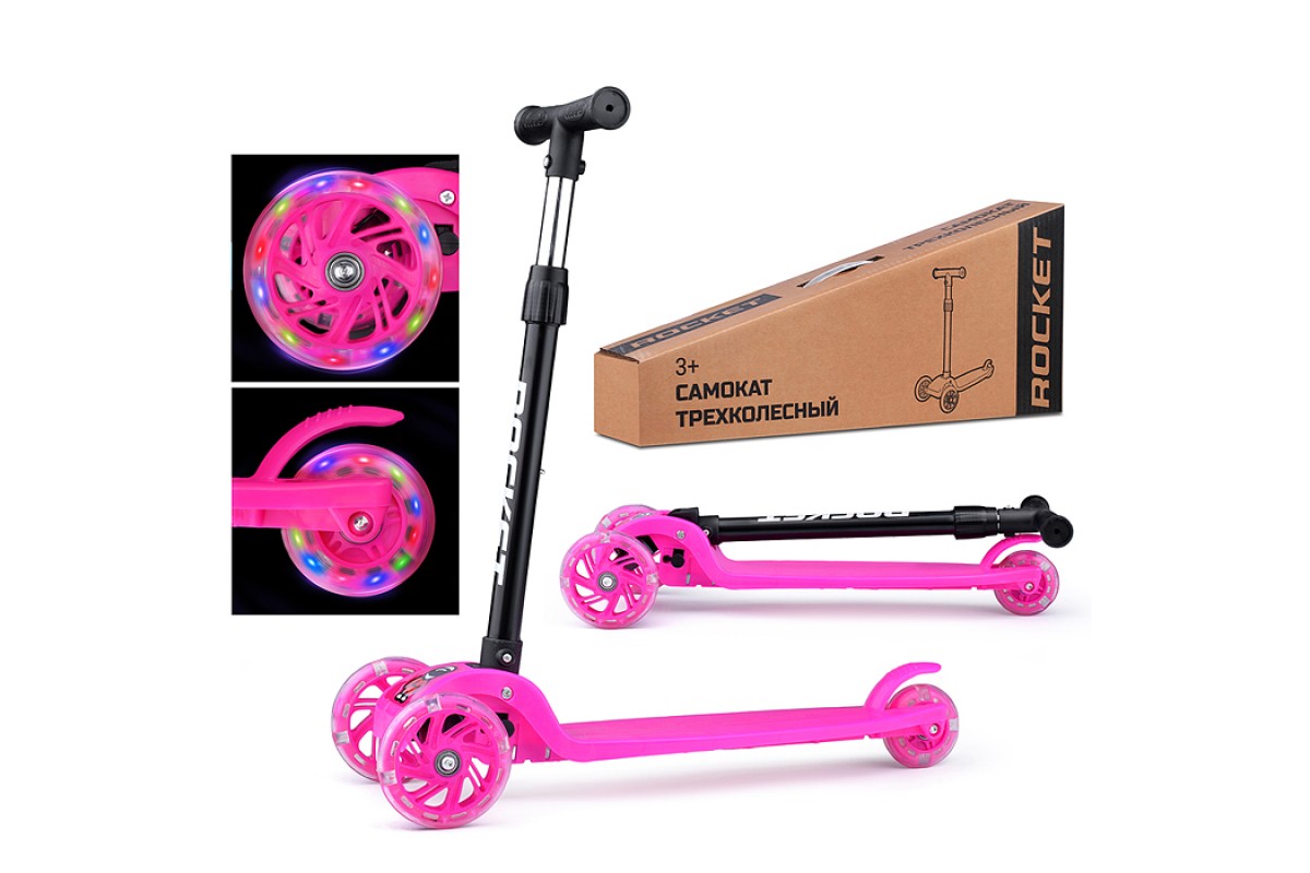 Самокат трёхколёсный ROCKET колёса световые PU, цвет розовый