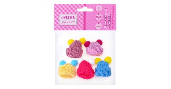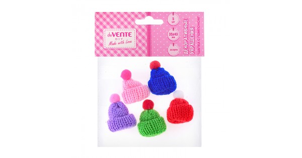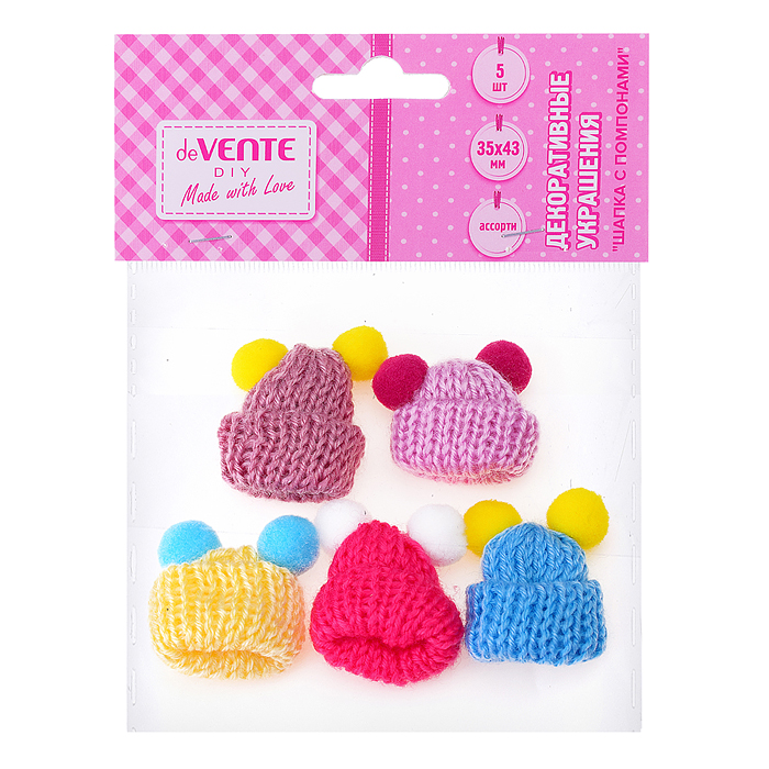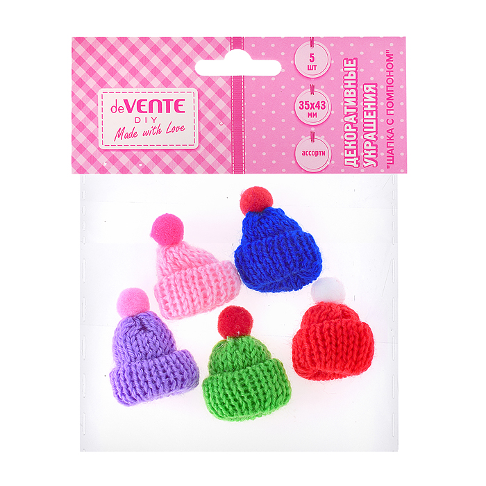 Декоративные украшения "Шапочка с помпонами" трикотажные, 35x43 мм, 5 шт, в пластиковом пакете с блистерным подвесом, цвета ассорти