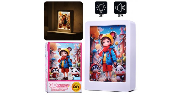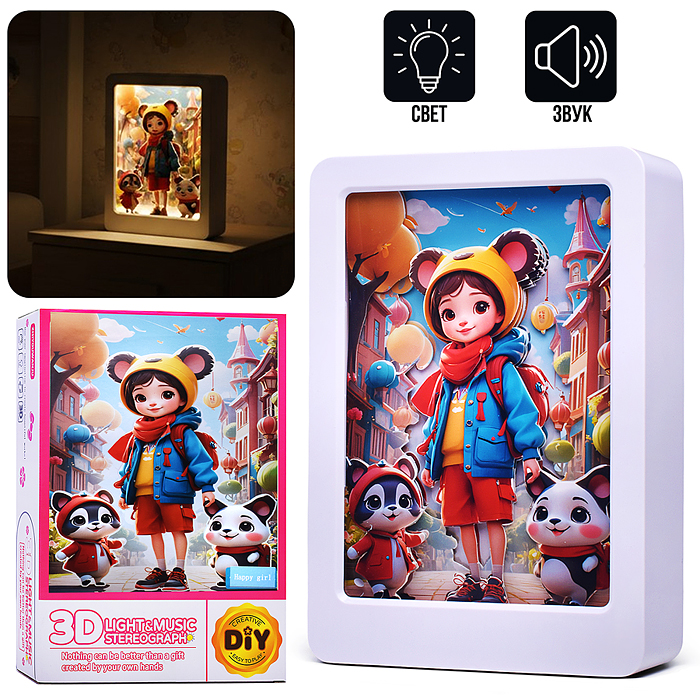 Ночник-пазл 3Д "Девочка-зоолог со зверушками" со светом и музыкой, в коробке