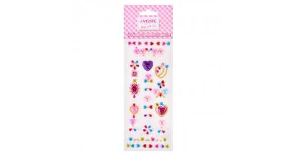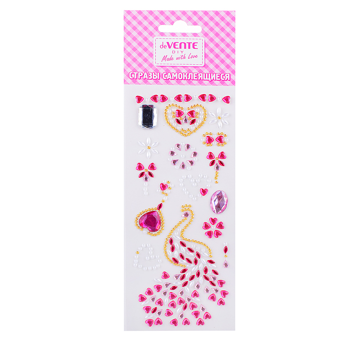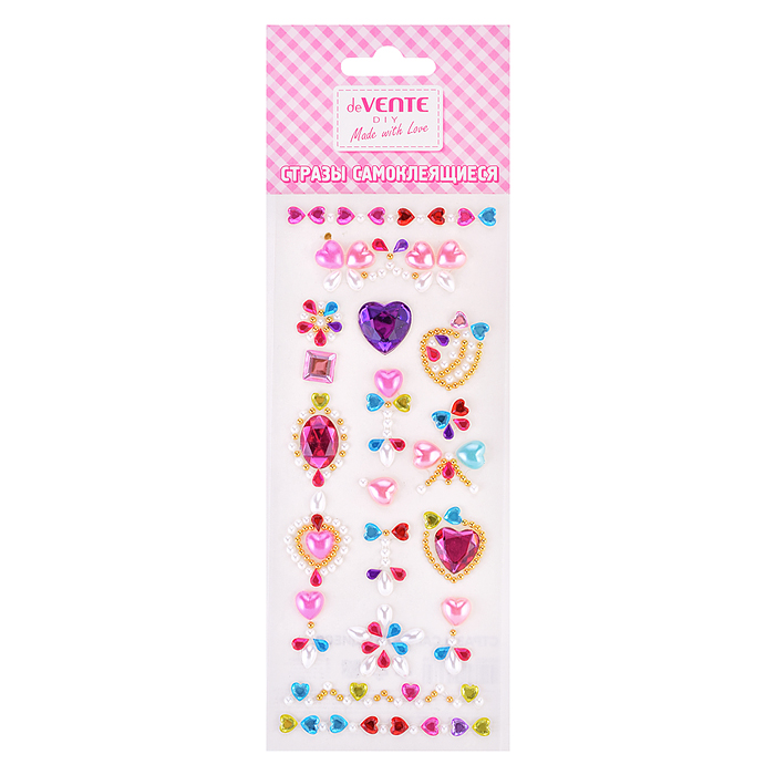 Стразы самоклеящиеся "Сердечки" акриловые, карточка 7,5x18 cм, цвета ассорти, в пластиковом пакете с блистерным подвесом