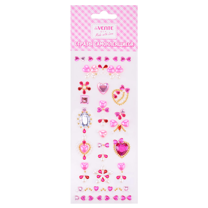 Стразы самоклеящиеся "Сердечки" акриловые, карточка 7,5x18 cм, цвета ассорти, в пластиковом пакете с блистерным подвесом