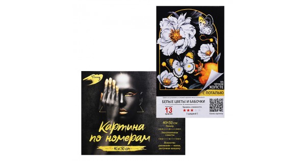 Картина по номерам 40х50 "Белые цветы и бабочки" черный холст с поталью (13 цветов)