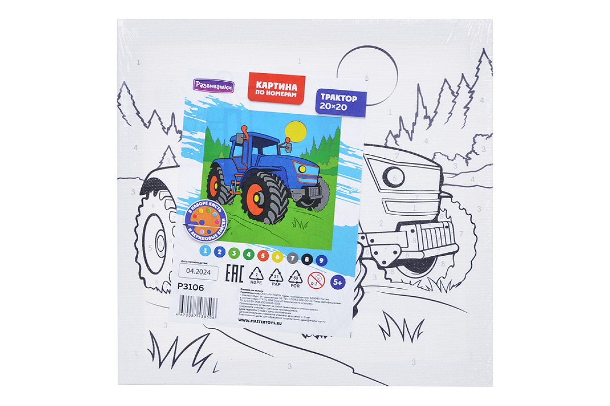 В комплект входят : краски акриловые 9 цветов,кисть,холст на деревянном подрамнике 20*20*1.5 см с нанесенным контуром