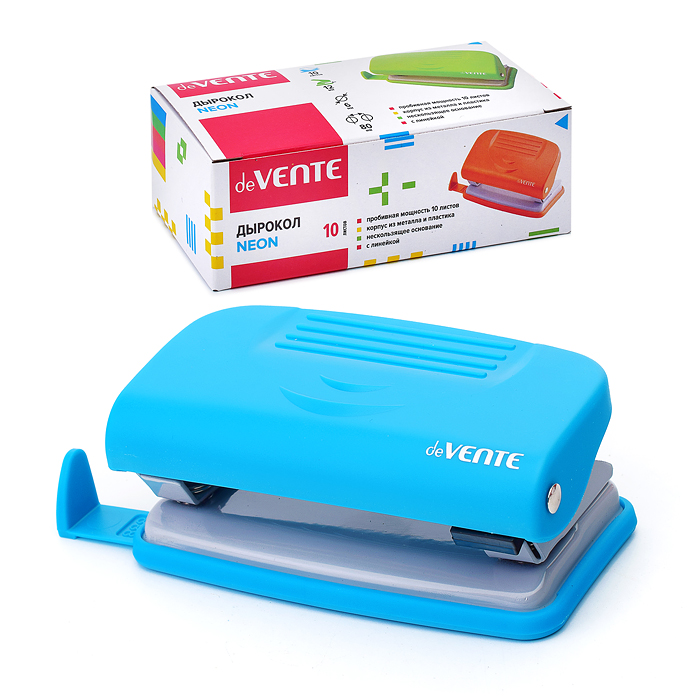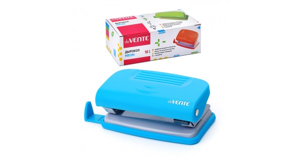 Дырокол "Neon" (10 листов) пластиковый с линейкой, в картонной коробке, неоновый голубой