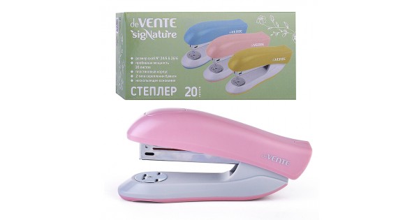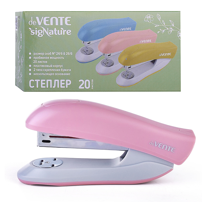 Степлер "SigNature" 24/6&26/6 (мощность 20 листов, глубина скрепления 60 мм) пластиковый, в картонной коробке, цвет пудрово-розовый