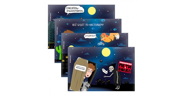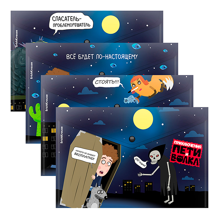 Папка-конверт на кнопке пластиковая Приключения Пети и Волка, A4, ассорти (в пакете по 12 шт.)