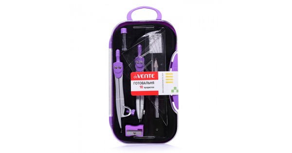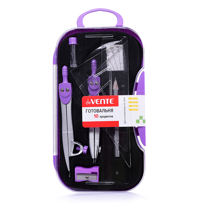 Готовальня (10 предметов) в пластиковом футляре с черным ложементом, цвет футляра - фиолетовый