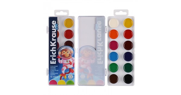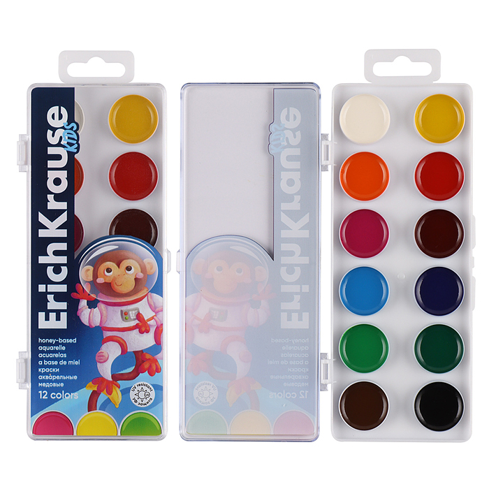 Краски акварельные "Kids Space Animals" медовые с УФ защитой яркости 12 цветов (в пластиковой коробке с европодвесом)