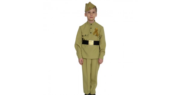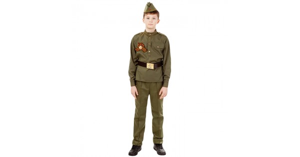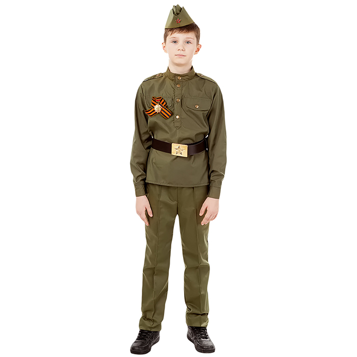 Костюм "Солдат хлопок" (гимнастерка, брюки, пилотка, ремень,георгиевская лента) размер 128