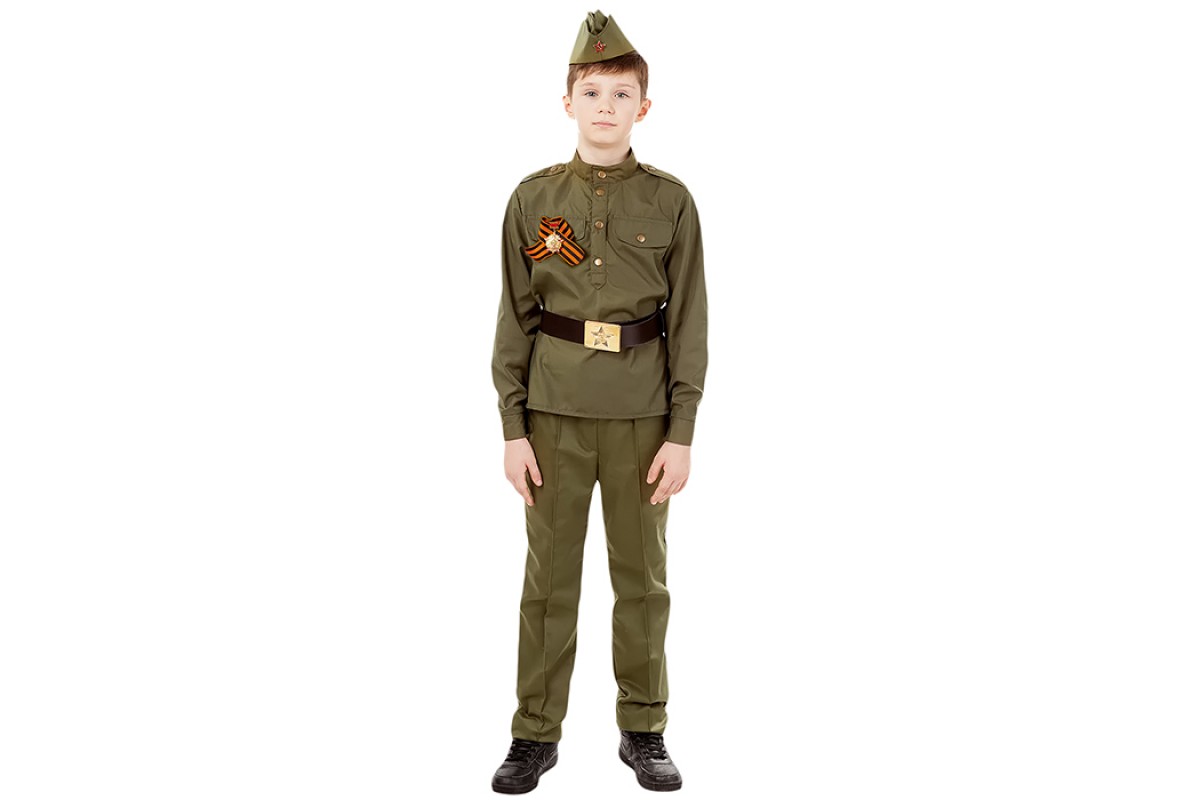Костюм "Солдат хлопок" (гимнастерка, брюки, пилотка, ремень,георгиевская лента) размер 128