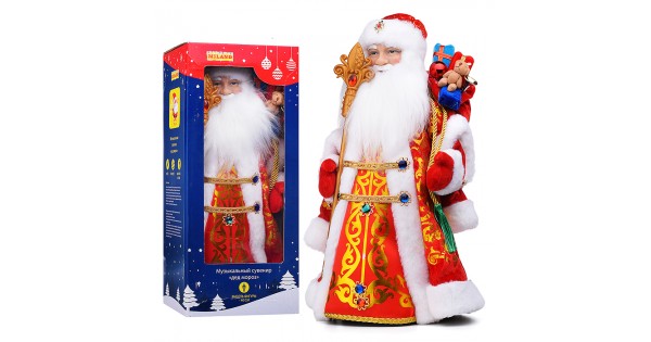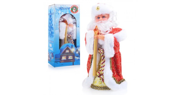 Дедушка Мороз с посохом в красной шубе, музыкальный 30см в пакете