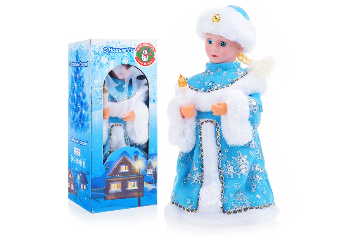 - при включении игрушка двигает руками и головой; свечка в руке светится; Снегурка поздравляет с Новым годом и воспроизводит фрагмент песни "Маленькой ёлочке холодно зимой" (запись автоматически повторяется);