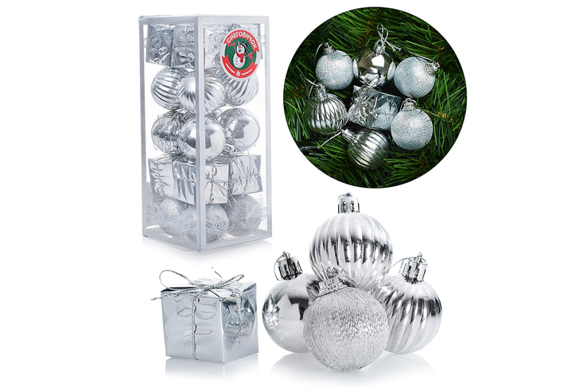 Набор новогодних украшений "Сияние" серебро (20шт) в коробке