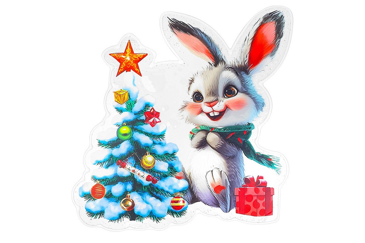Силиконовая новогодняя наклейка "Зайчик у ёлки" 25*25см