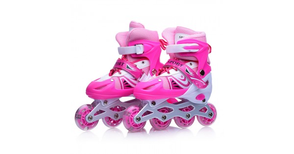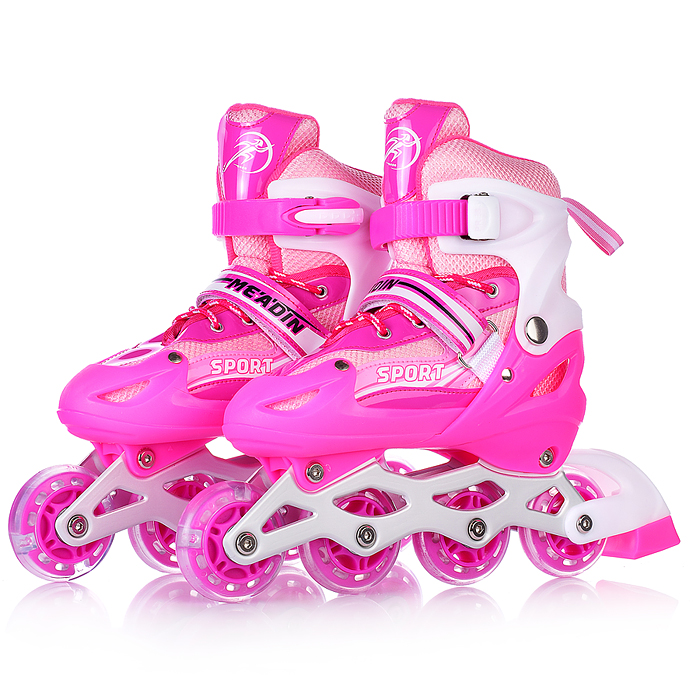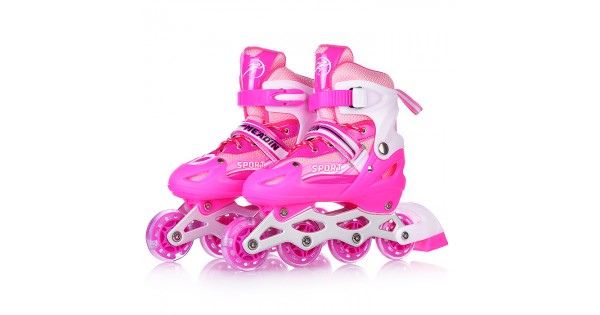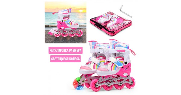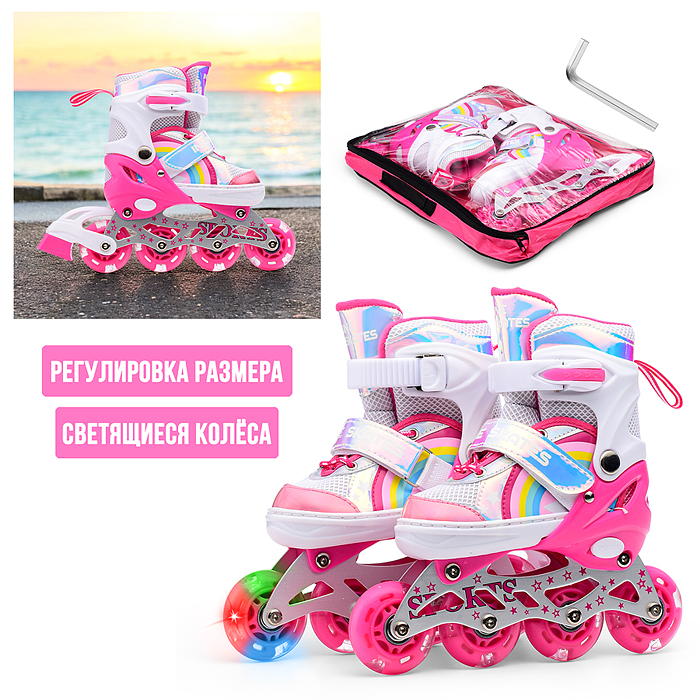 Ролики детские (размер M) розово-белые, PU колёса со светом, в сумке