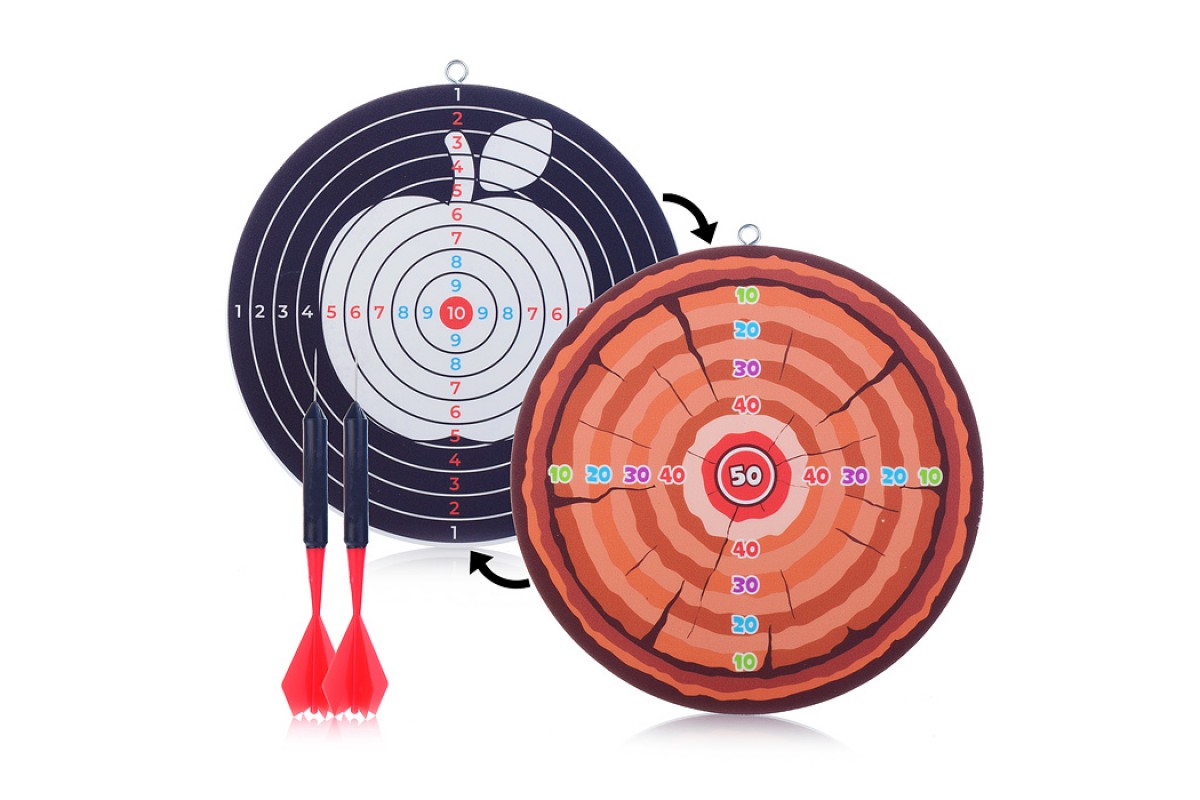 В набор Дартс MEGA TOYS входит мишень из прочного и упругого материала с двусторонней печатью и 2мя дротиками. Мишень сделана с удобной и надежной металлической петелькой для крепления.