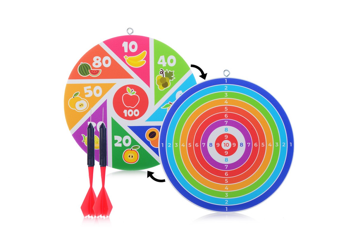 В набор Дартс MEGA TOYS входит мишень из прочного и упругого материала с двусторонней печатью и 2мя дротиками. Мишень сделана с удобной и надежной металлической петелькой для крепления.