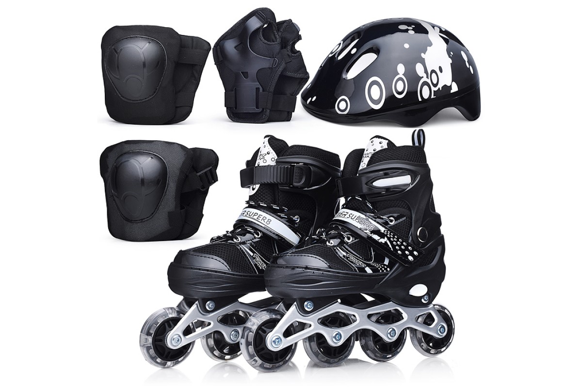 Ролики детские, размер M, черные (со шлемом и защитным снаряжением)