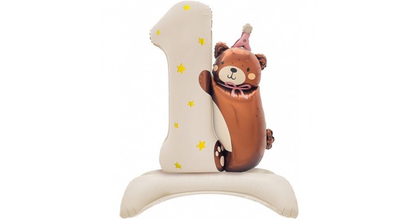 Шар (35''/89 см) Цифра на подставке, 1 Годик, Мишка в розовом колпачке, Бежевый, 1 шт. в уп.