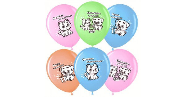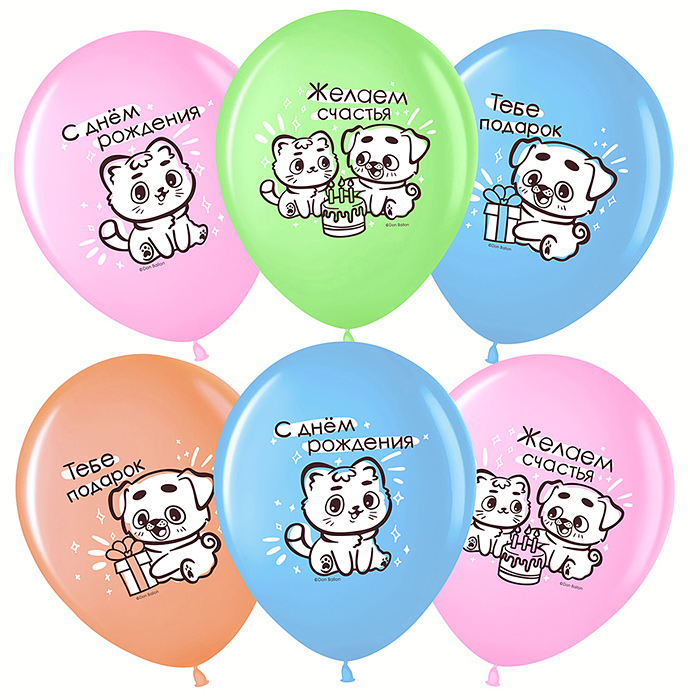 Шар (12''/30 см) С Днем Рождения (котенок и щенок), Ассорти, пастель, 1 ст, 25 шт.