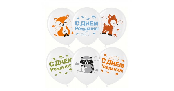 Шар (12''/30 см) Лесные зверята, С Днем Рождения!, Белый (200), пастель, 2 ст, 25 шт.