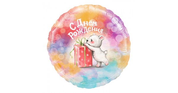 Шар (18''/46 см) Круг, С Днем Рождения (мишка с подарком), Градиент, 1 шт. в упак.