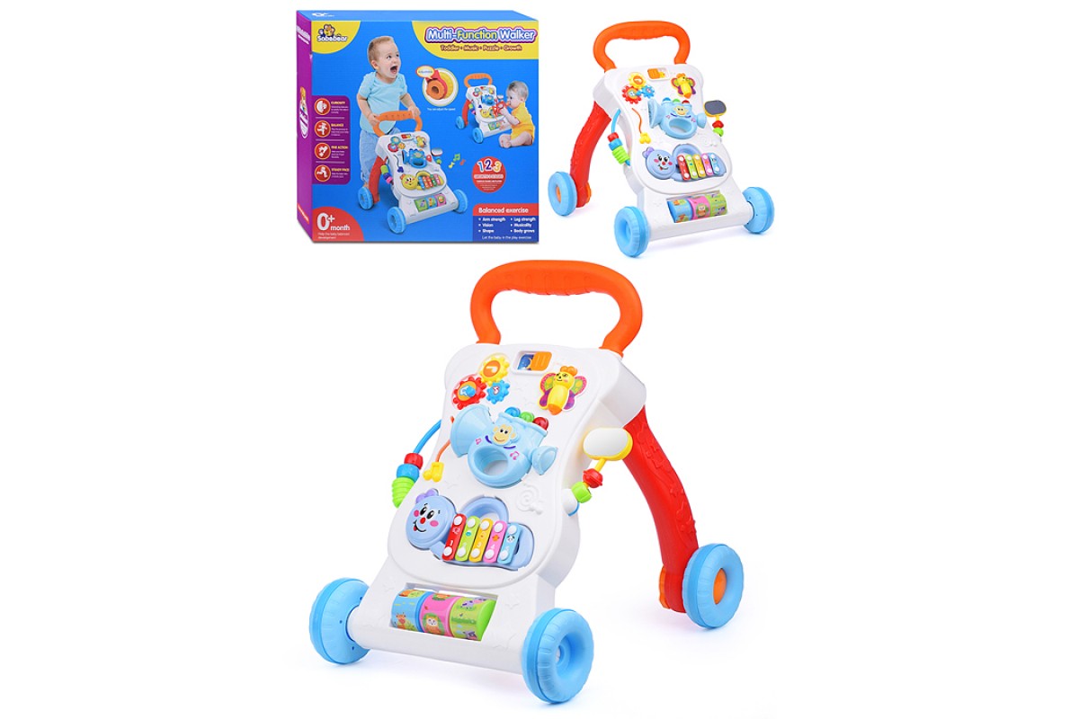 Функции ходунков: вращающиеся элементы, съёмный металлофон, съёмная музыкальная дудка, фиксаторы на задних колёсах
