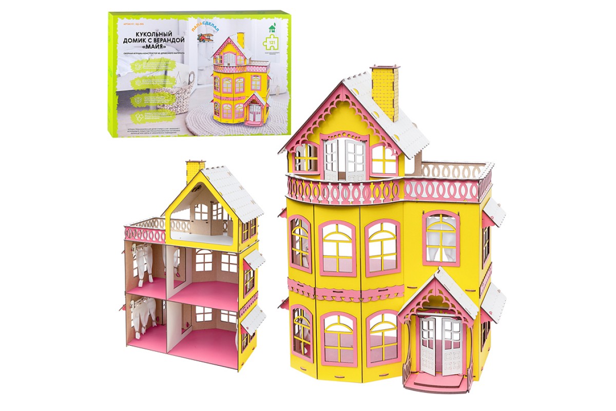 Трёхэтажный домик в собранном виде не займёт много места в детской комнате. Внутри домик очень просторный для игры с куклами и вместительный для размещения комплектов мебели.