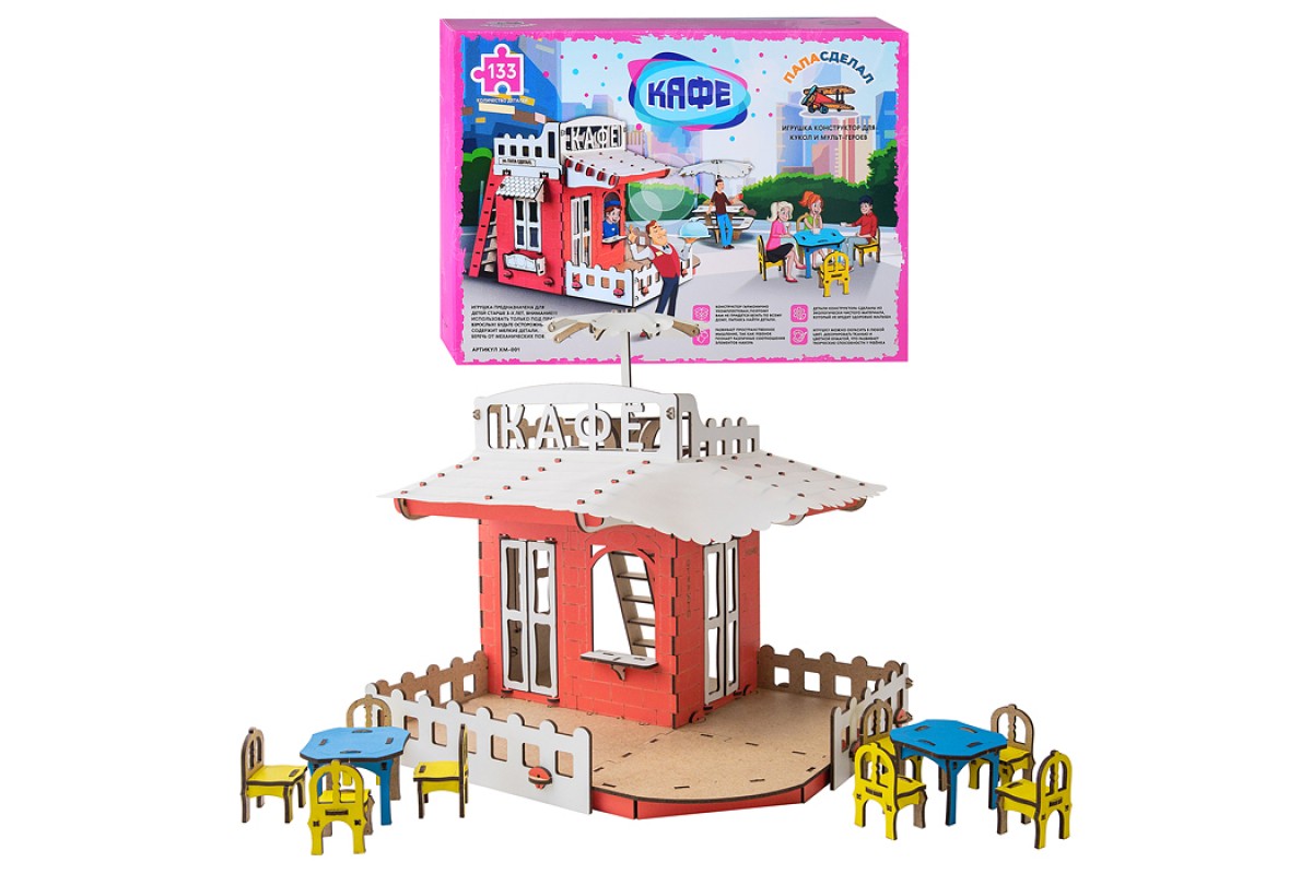 Двухэтажное кафе в собранном виде не займёт много места в детской комнате. Конструктор собирается очень легко и быстро в пазы, без клея. Домик можно декорировать цветной бумагой.
