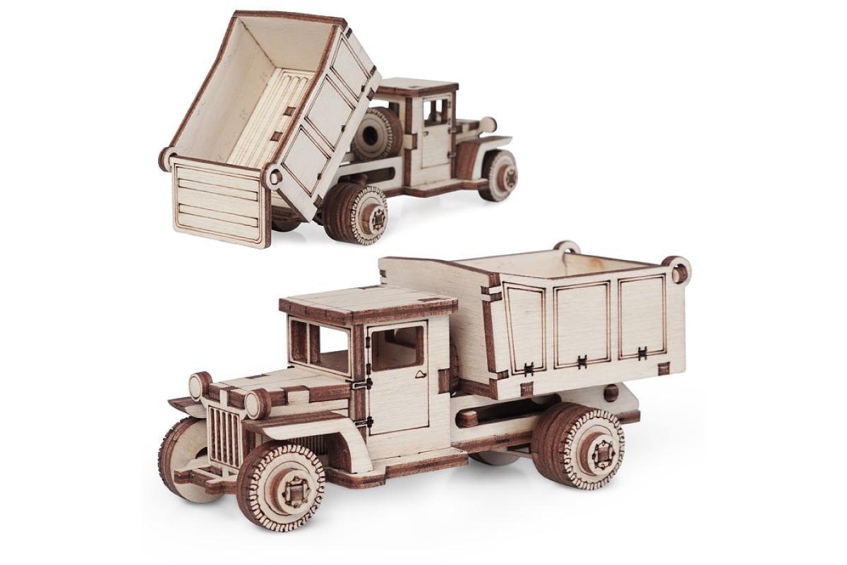 У собранной модели вращаются колеса, поднимается кузов и откидывается задний борт кузова.