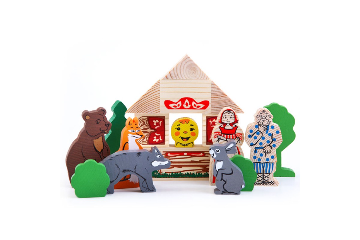 • Элементы сказки представляют собой деревянные модели персонажей и декорации.