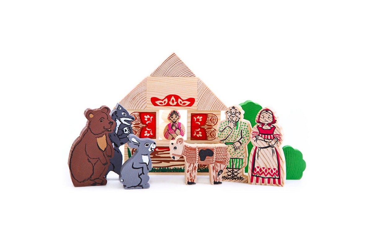• Элементы сказки представляют собой деревянные модели персонажей и декорации.