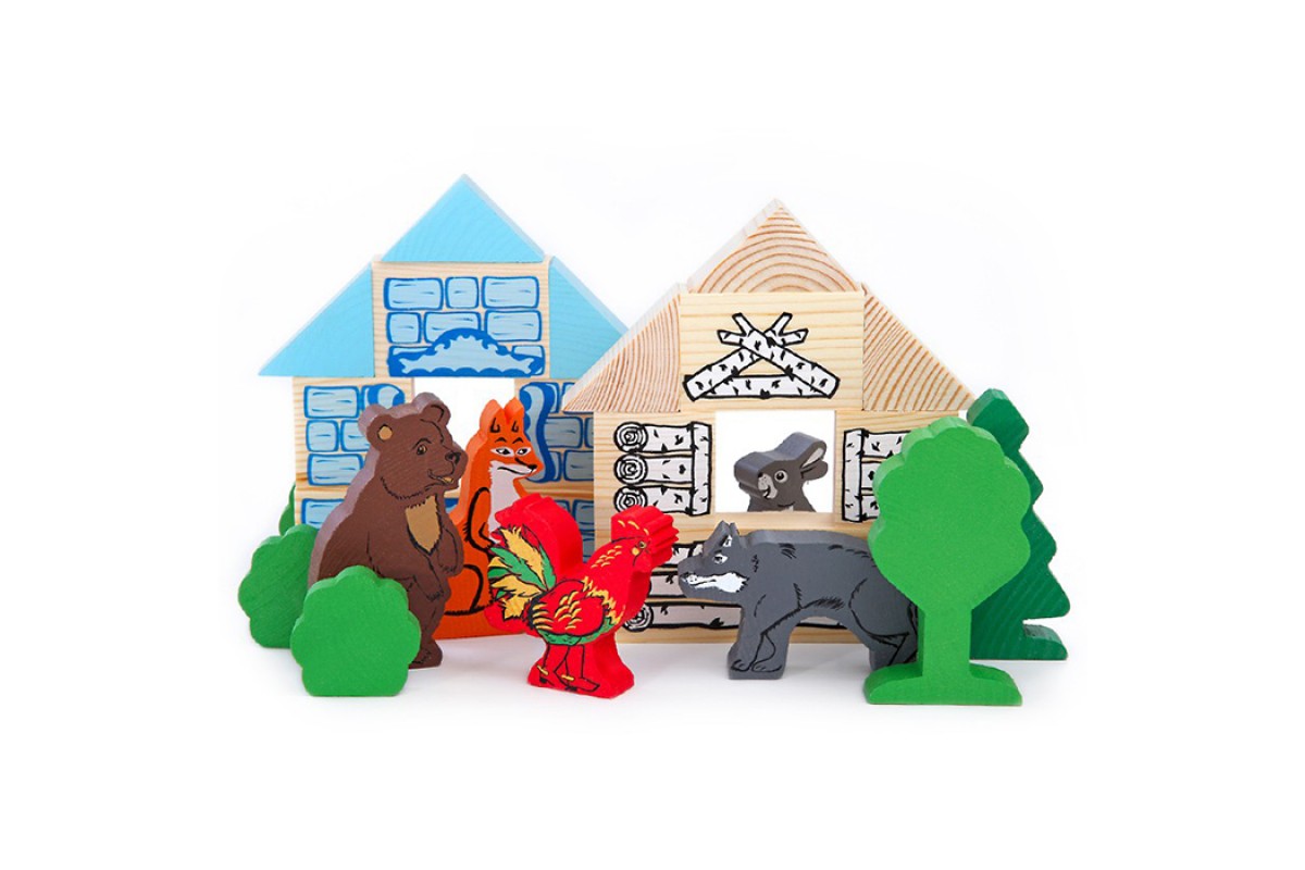• Элементы сказки представляют собой деревянные модели персонажей и декорации.
