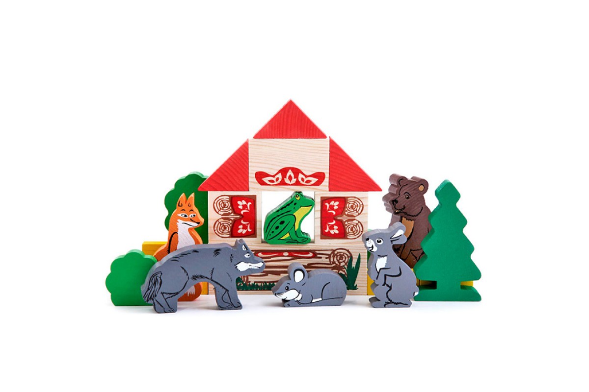 • Элементы сказки представляют собой деревянные модели персонажей и декорации.