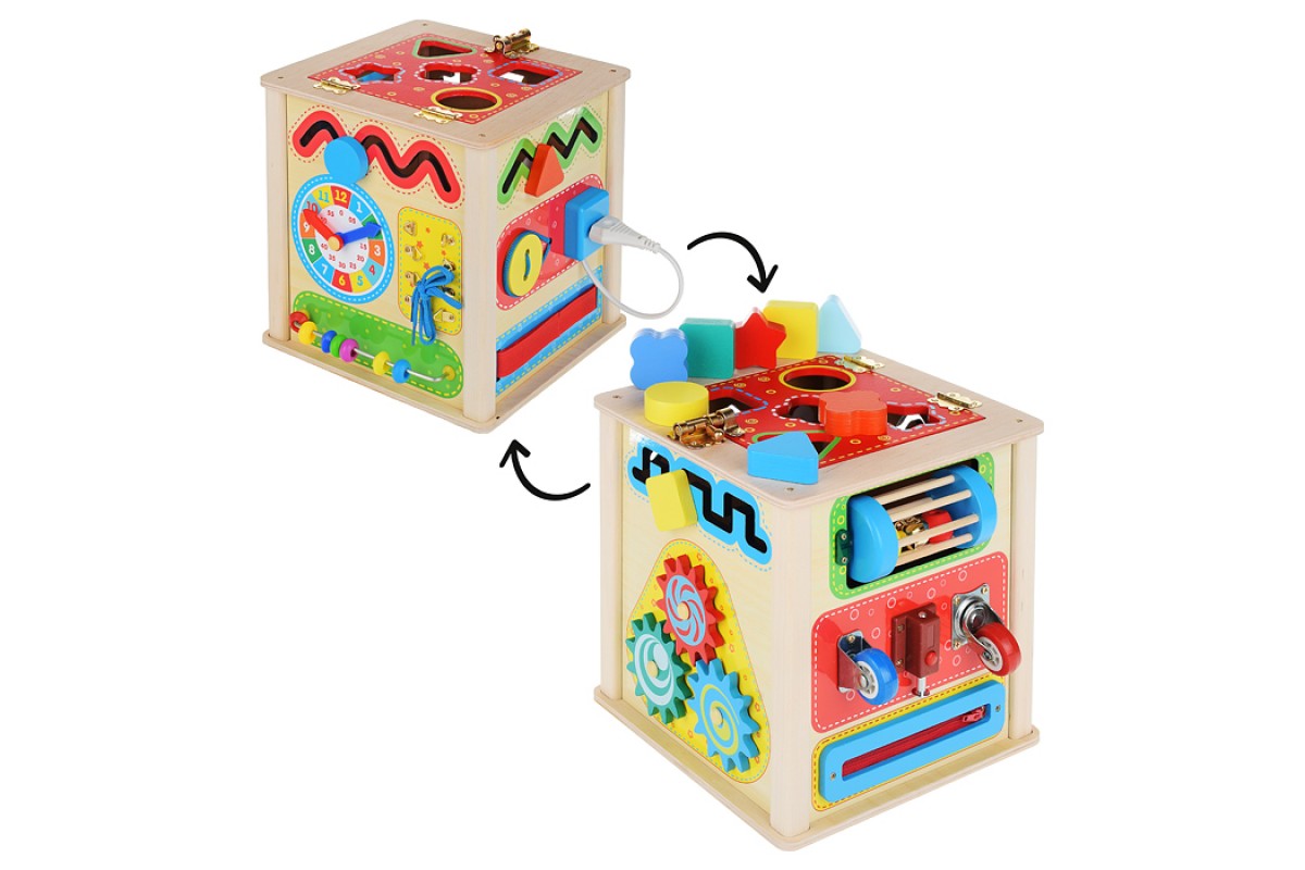 • Универсальный куб состоит из 5 модульных досок, на каждой из которых закреплены функциональные детали: шестерёнки, розетка с вилкой, барабан, змейка, часики, молния и т.д.