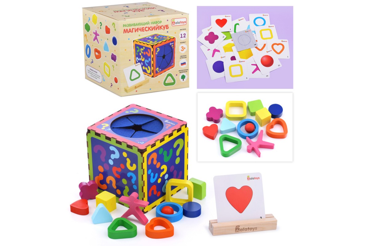 В красочной подарочной коробке ребенок найдет необычный куб, 12 полых и объемных фигурок и 12 двухсторонних карточек. Компоненты набора изготовлены из экологически чистой древесины и картона.
