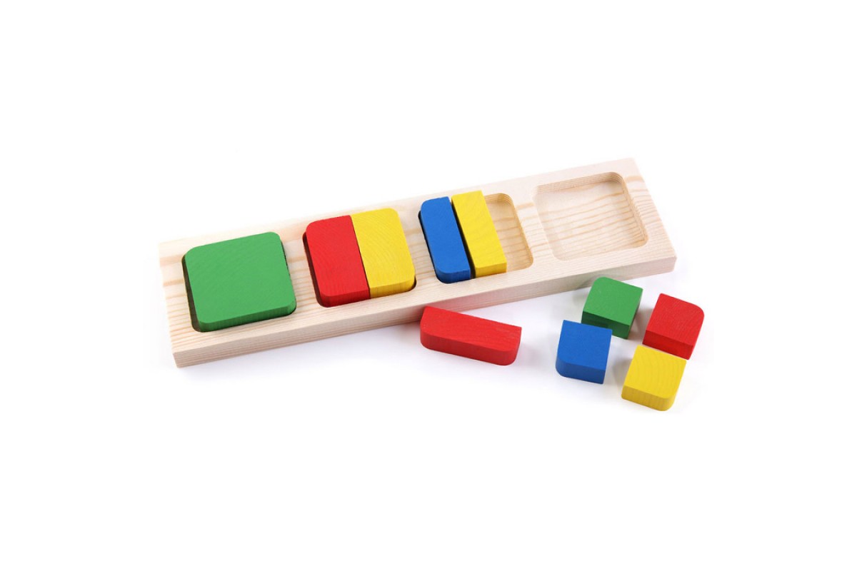 • В наборе деревянная основа, а также квадратные и прямоугольные детали, которые разделены на 1, 2, 3 и 4 частей.