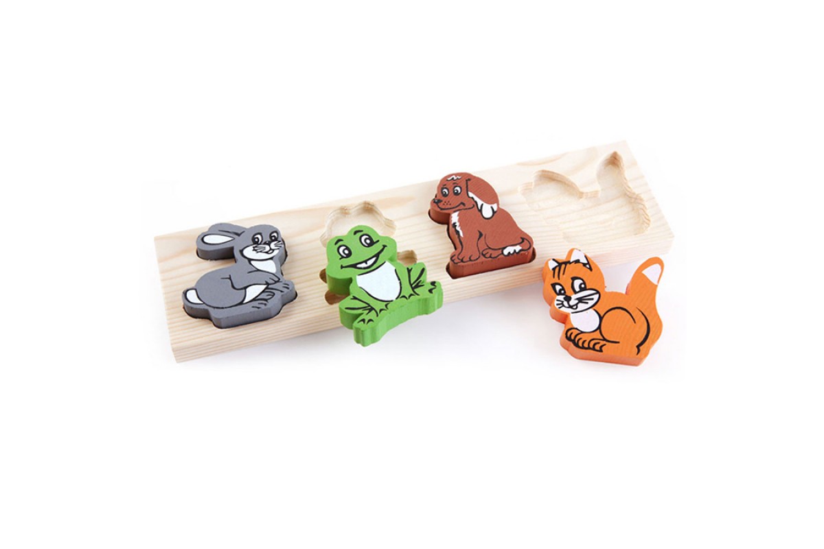 • В наборе деревянная основа с фигурными углублениями для зверушек.