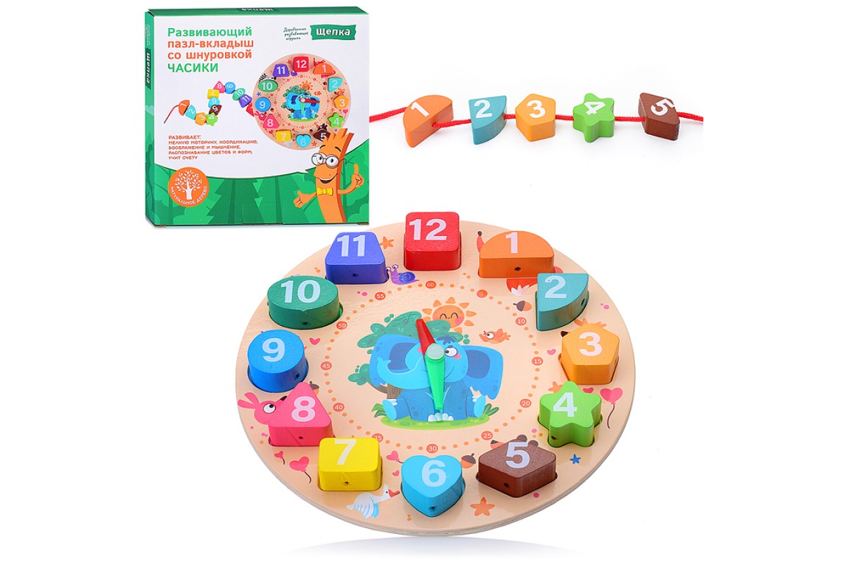 Пазл-вкладыш со шнуровкой "Часы - Слон и его друзья"