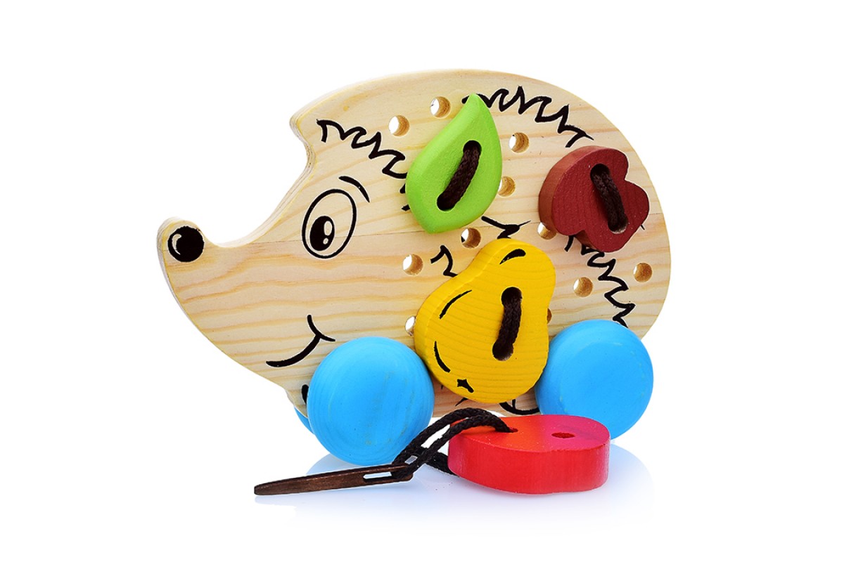 • Шнуровка-каталка включает 7 деталей: игровое поле-основание с отверстиями, 4 фигурки разного цвета и формы (в виде яблока, гриба, груши и листочка), шнурок и крупную деревянную иглу.