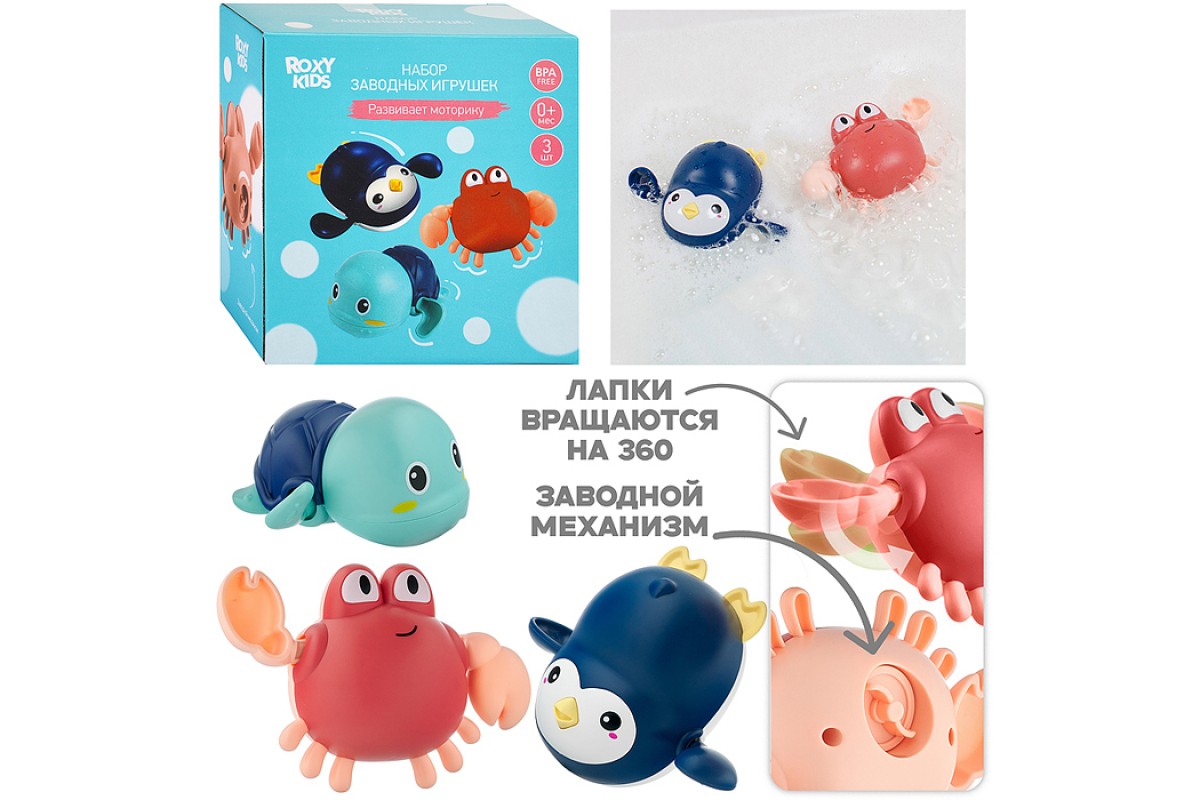 Игрушки для ванной заводные 3 шт (черепаха, краб, пингвин)