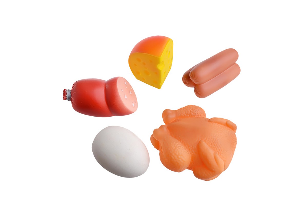 Размеры игрушек Яйцо 50х50х65 мм., Сосиски 77х46х37 мм., Сыр 47х49х66 мм., Колбаса 85х46х45 мм., Курочка 90х77х50 мм.