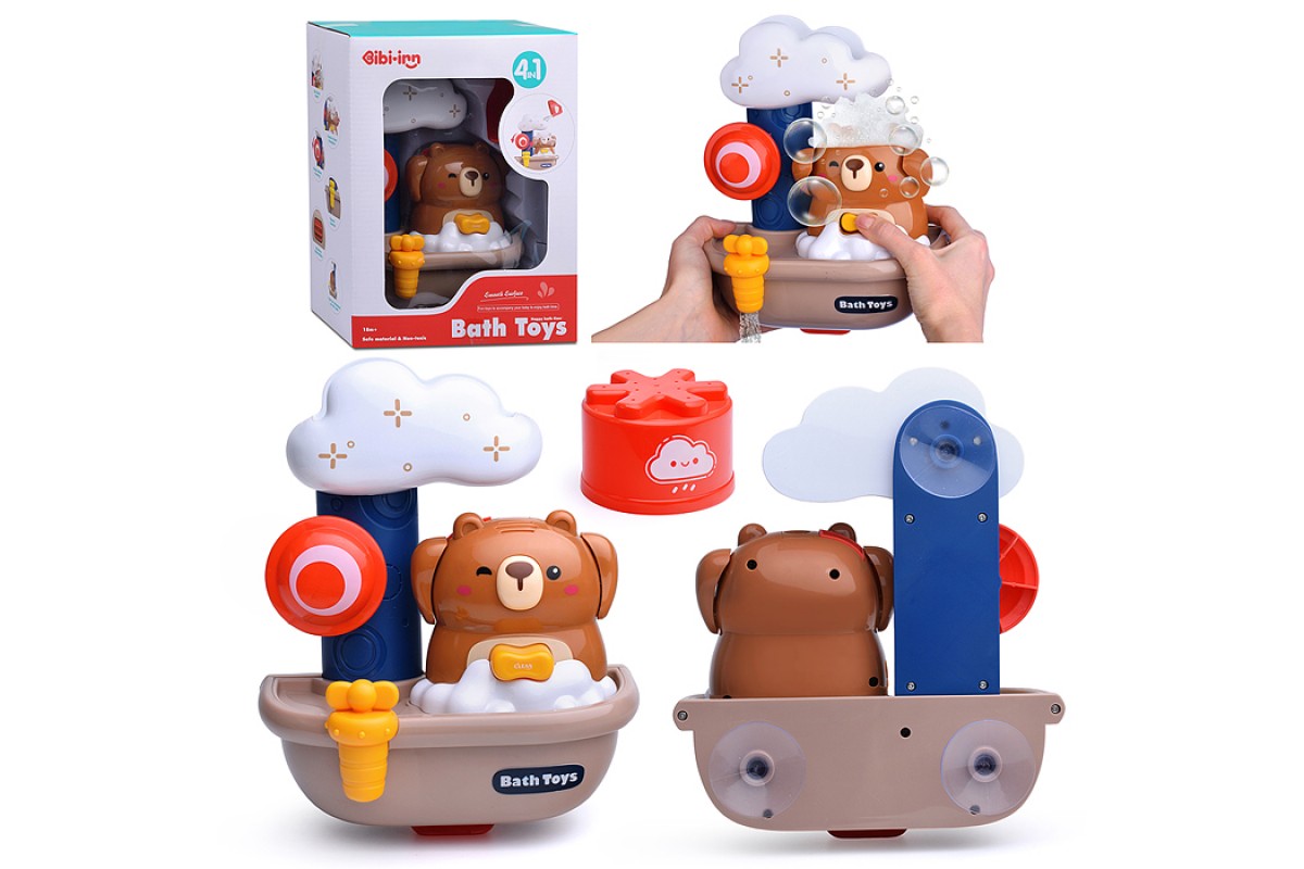На голову медведя можно добавить шампунь, при нажатии на кнопку на животе медведя он совершает моющие движения руками.
