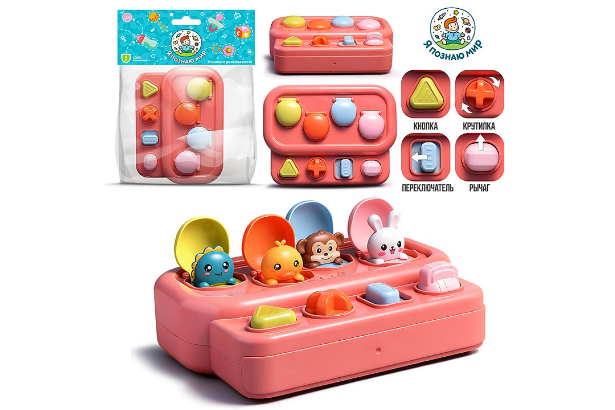 • При нажатии на рычаги и кнопки выскакивают фигурки животных.