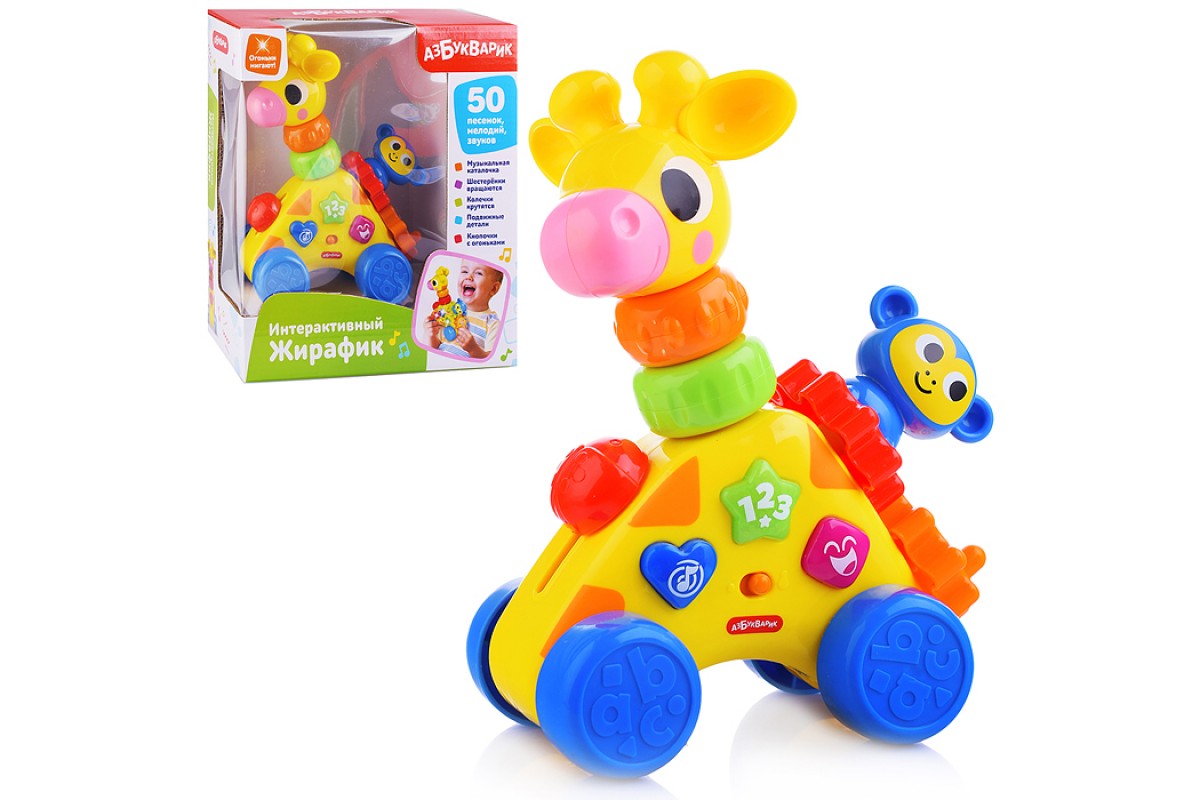 Кроме того, в интерактивном жирафике много интересных деталей, которые помогут малышу в развитии мелкой моторики и тактильных ощущений. Жучок-трещотка издает забавный звук, шестеренки на спине можно вращать, голова у жирафика крутится, на шее – колесики с шариками, которые звенят, как погремушка.