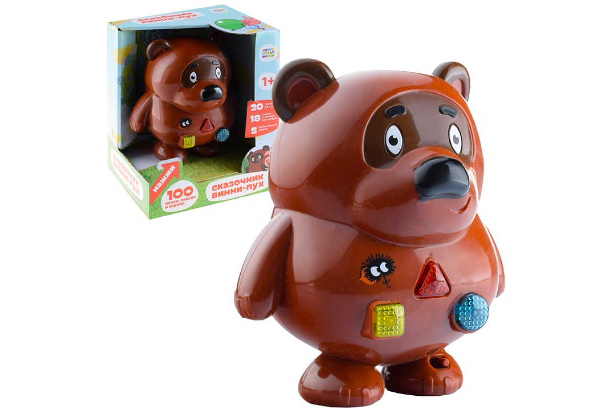 Интересная игрушка в виде Винни-Пуха, забавного персонажа одноимённого мультфильма, непременно понравится вашему ребёнку. Малыш с удовольствием будет нажимать на цветные фигурные кнопки и слушать увлекательные музыкальные сказки, песни из любимых мультфильмов, стихи, а также отгадывать загадки. В такой увлекательной игровой форме ребёнок с лёгкостью сможет выучить цифры. Музыкальная игрушка развивает слуховое восприятие и музыкальный слух, тактильные навыки, визуальное восприятие, моторику, память.