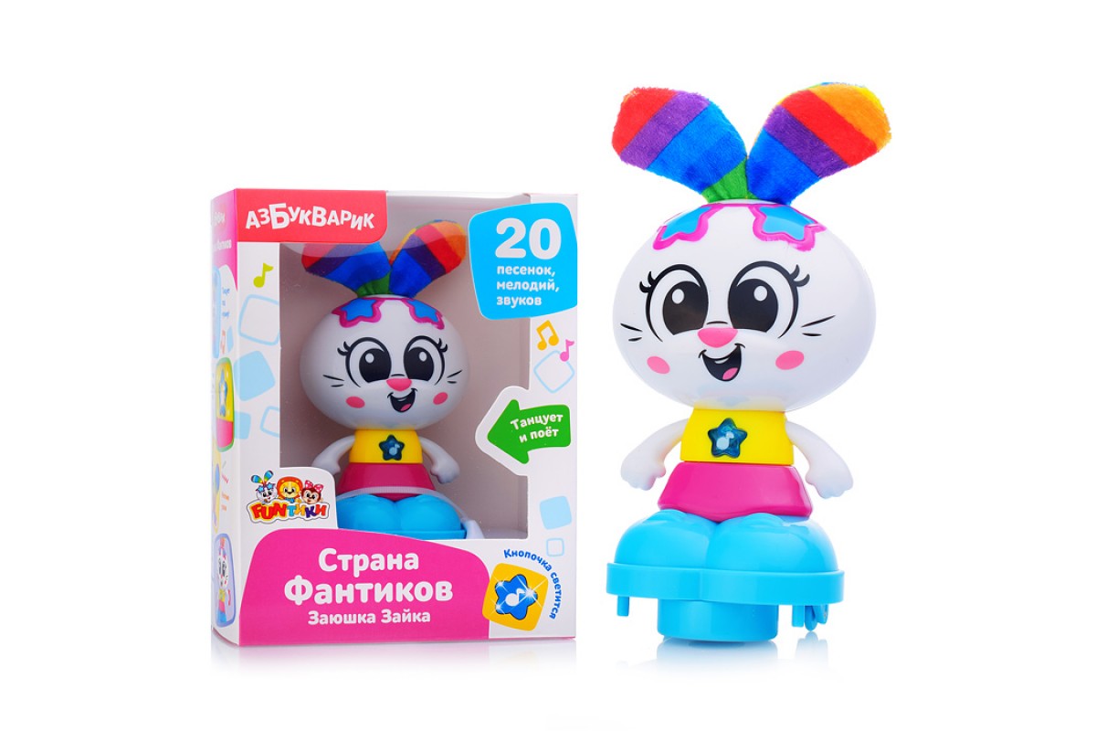 Зайка очень веселая, любит петь и танцевать, и малыш обязательно захочет с ней подружиться. Нажимайте на кнопочку-звездочку – Зайка споет 7 песенок и мелодий («Песенка Зайки», «Песенка Фантиков», «Как чудесно жить на свете», «Догони» и др.). Огонек на кнопочке мигает!