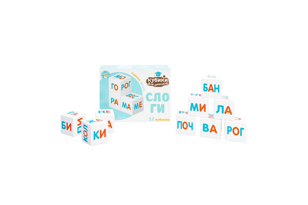 - 12 кубиков с буквами и слогами, которые легко комбинировать для формирования слов.